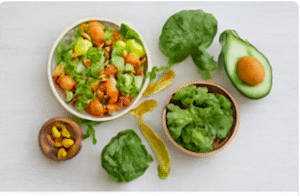 - Lunch: Grilled chicken salad with olive oil, avocado, and colorful veggies